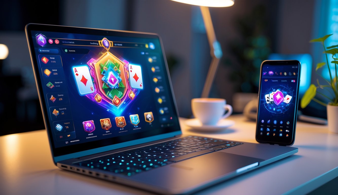 Sebuah laptop dan ponsel menampilkan permainan kartu digital di atas meja dengan latar belakang ruangan kantor rumah yang nyaman.